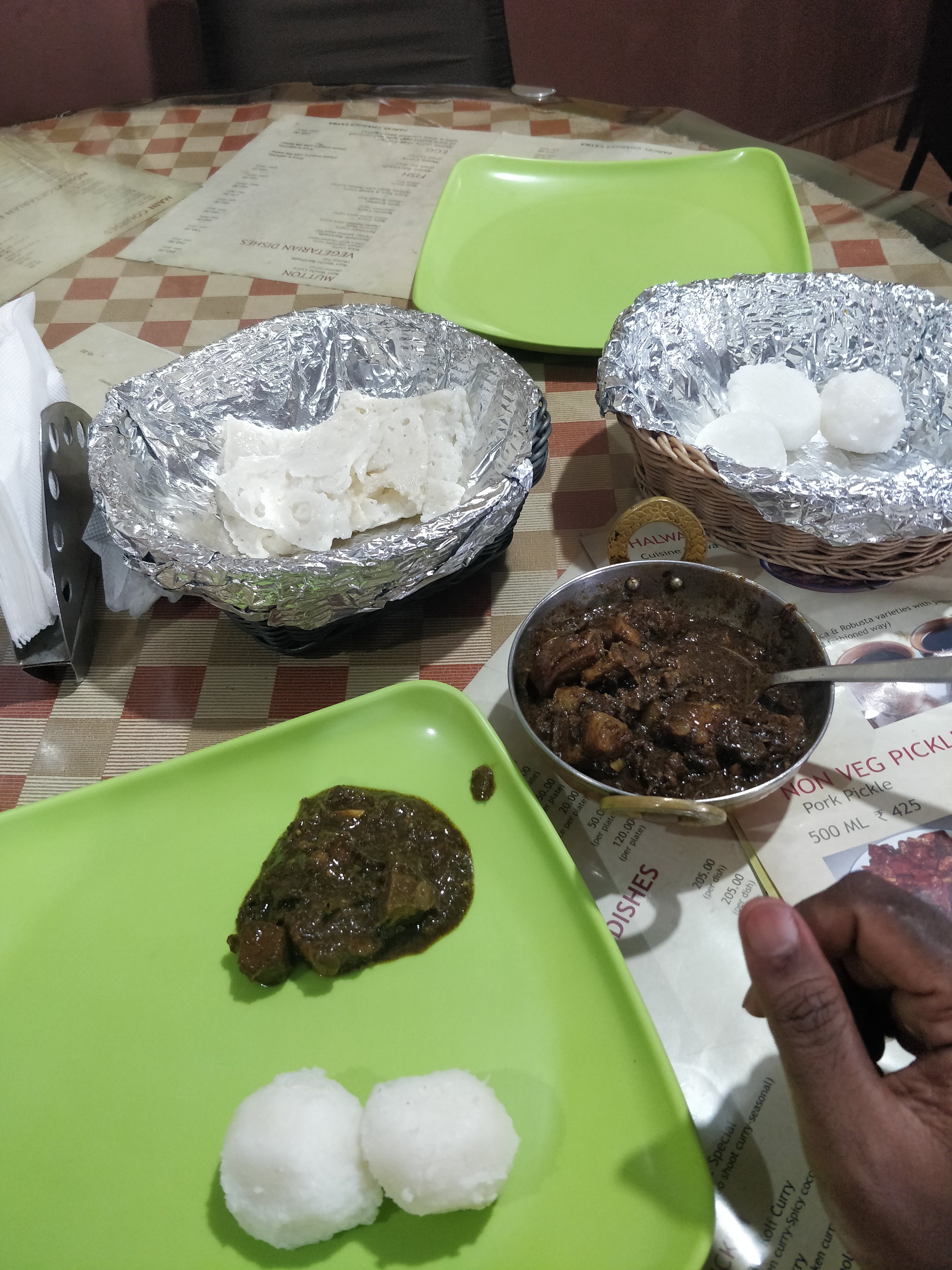 Menu is limited, it is a simple 30pax seater hotel, I tried pandhikari, puttu, neer dosai, coconut dessert. Even their vegetarian items were good. Do try the pork chops, gravy or semi gravy - itâs all upto you to customize. This lunch was fulfilling, the best pork I had ever eaten, even better than the pork knuckle I had in Munich at Haffbrauhouse.